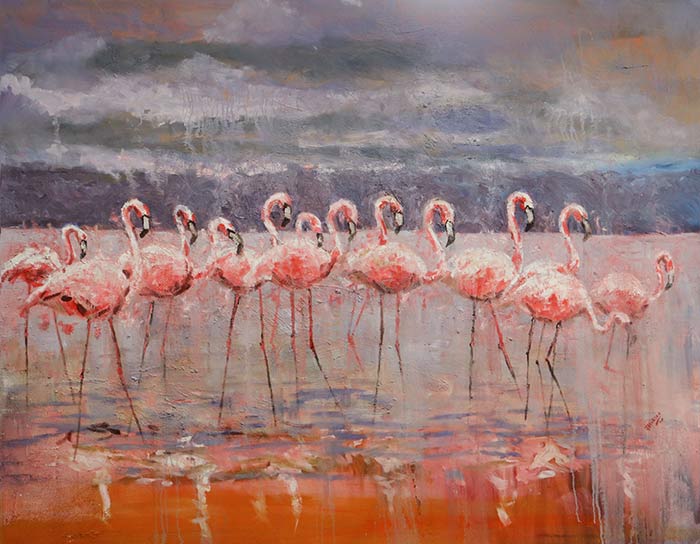 Mubiru's Lake of Fire showcases the striking pink hues of the birds against the backdrop of the lake's shimmering waters, highlighting the unique interplay of color and light. This piece not only reflects the beauty of the avian population but also serves as a reminder of the ecological significance of Lake Nakuru as a sanctuary for wildlife.