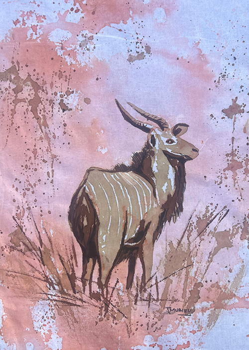 Batik painting of the Nyala African antelope, created by the artist John Mubiru. Native to mainly Southern Africa, this piece showcases Mubiru's skillful technique and deep appreciation for wildlife.