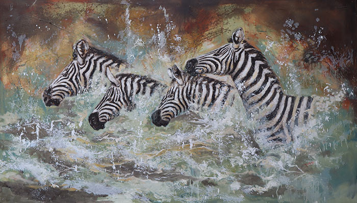 An oil painting by John Mubiru captures the dramatic scene of zebras navigating the treacherous Mara River